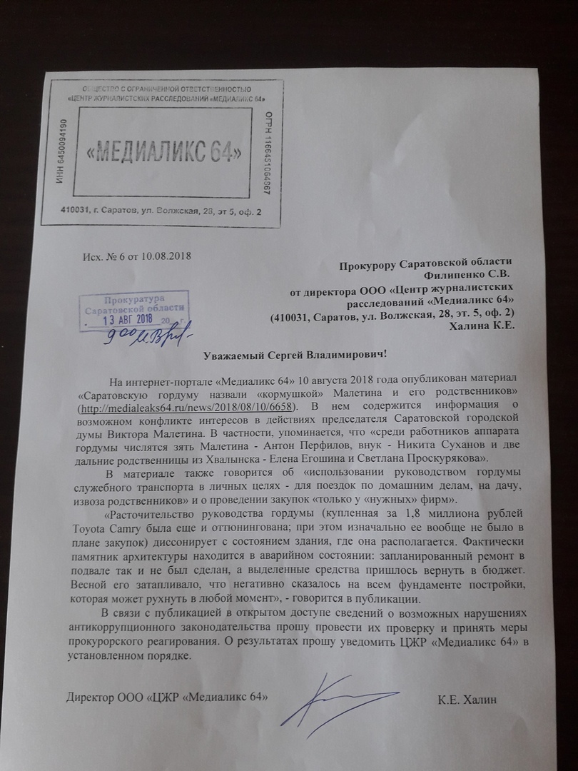 «В связи с публикацией в открытом доступе сведений о возможных нарушениях антикоррупционного законодательства прошу провести их проверку и принять меры прокурорского реагирования», - пишет «Медиаликс 64» в направленном Сергею Филипенко обращении.