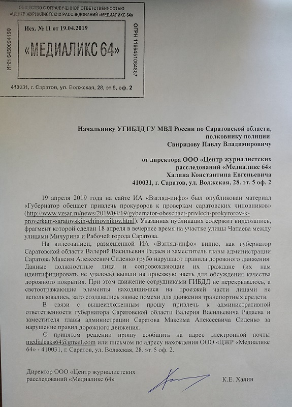 В связи с вышеизложенным прошу привлечь к административной ответственности губернатора Саратовской области Валерия Васильевича Радаева и заместителя главы администрации Саратова Максима Алексеевича Сиденко за нарушение правил дорожного движения», - говорится в обращении «Медиаликс 64» к начальнику УГИБДД.