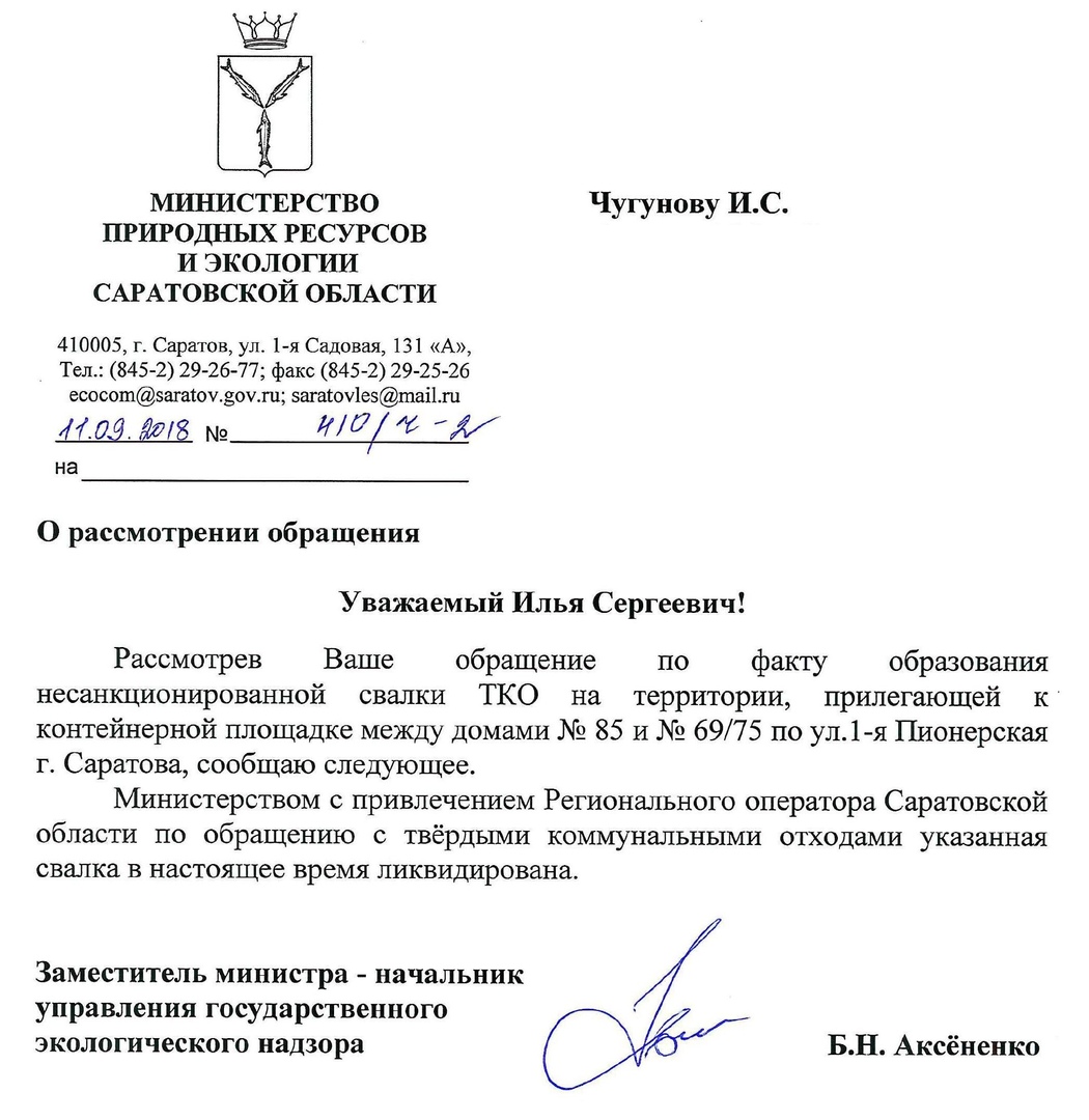 Гражданам пришел ответ за подписью замминистра – начальника управления государственного экологического надзора Бориса Аксененко. В нем говорится, что министерство совместно с регоператором Саратовской области по обращению с ТКО ( АО «Управление отходами») ликвидировали данную мусорку.