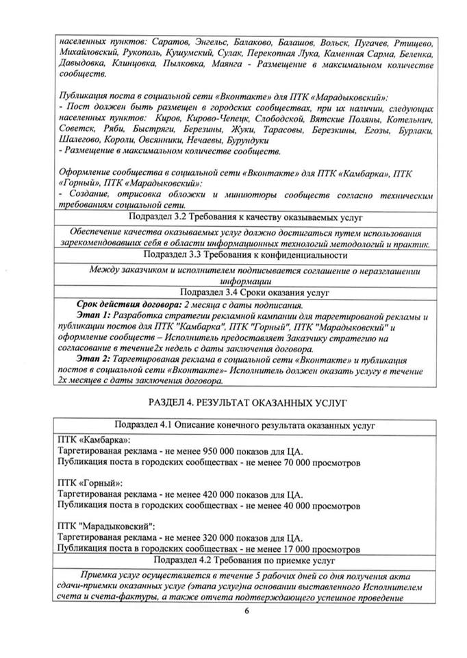 При этом результатом оказанных услуг по SMM продвижению заказчик считает: для ПТК «Камбарка» - не менее 950 тысяч показов таргетированной рекламы и 70 тысяч просмотров промо-поста в городских сообществах; для ПТК «Горный» - не менее 420 тысяч показов и 40 тысяч просмотров; для ПТК «Марадыковский» - 320 тысяч показов и 17 тысяч просмотров.