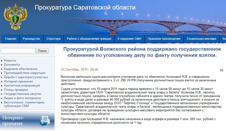 «Судом установлено, что 10 марта 2011 года в период времени с 15 часов 00 минут до 15 часов 35 минут заместитель директора ГАУК «Саратовской академический театр оперы и балета» Аксенова Н.В., являясь должностным лицом, находясь в своем служебном кабинете в здании театра, получила лично от гражданина Ч. взятку в виде денег в размере 40 тысяч рублей за незаконные действия в пользу взяткодателя, а именно за необоснованное заключение между ООО «Тефлекс Столица» и Государственным автономным учреждением культуры «Саратовский академический театр оперы и балета», являющимся подведомственным министерству культуры области, договора на проведение культурно-массового мероприятия без согласования с министерством культуры области.