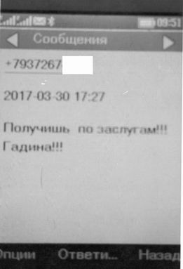 Как рассказала корреспонденту «Медиаликс 64» Ольга Курочкина, после приема у Сергея Аренина с телефона сожительницы бывшего мужа на нее обрушился поток смс-сообщений угрожающего и оскорбительного содержания. Часть из них она предоставила в распоряжение нашей редакции, которые мы не можем опубликовать без купюр по этическим соображениям («Останешься со своими выб… дками на улице!!», «Сядешь. Я обещаю», «Онколог (Курочкина работает врачом - прим. ред.) е..чий!! и твои пациенты!!!» и другие).
